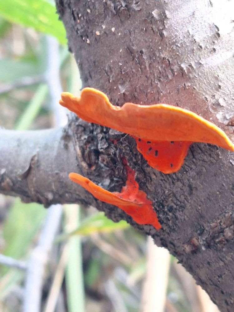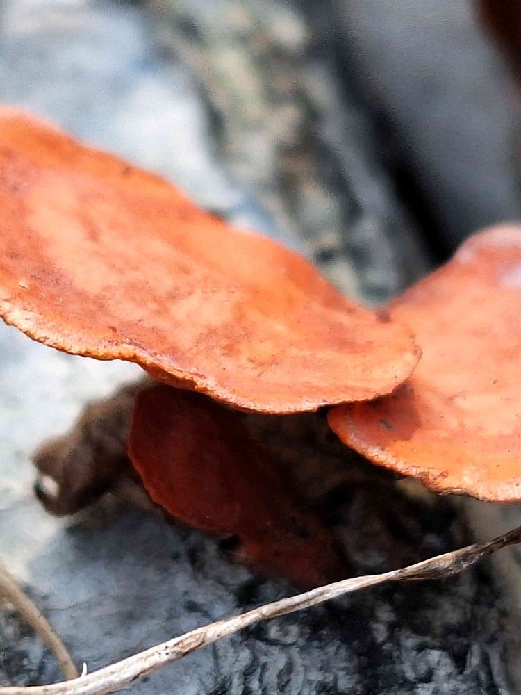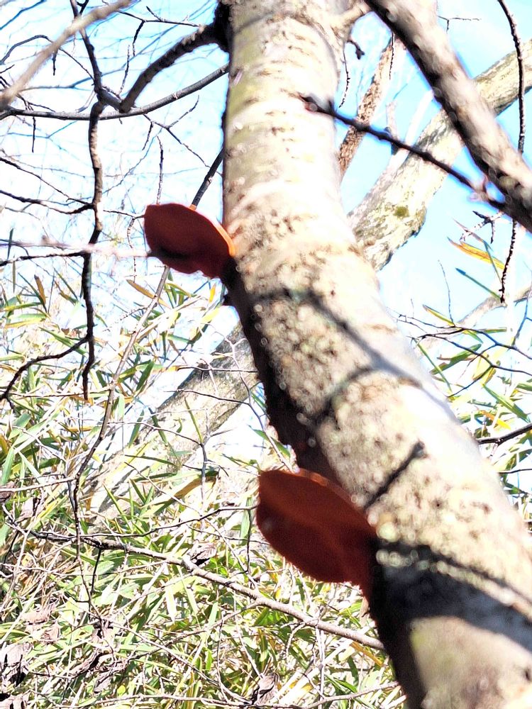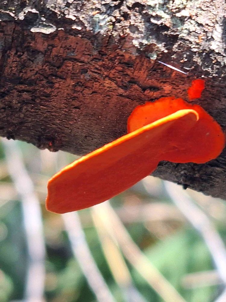 ヒイロタケやシュタケが生えてる朽木は朽木の中も朱色になってキレイなんですよね😍