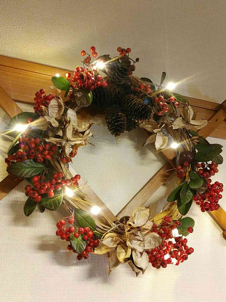 電飾は、去年100円ショップで買ったもので、10この電球がついていて、リースに巻いていくと、ちょうどよい長さで、リースに打ってつけです😃v