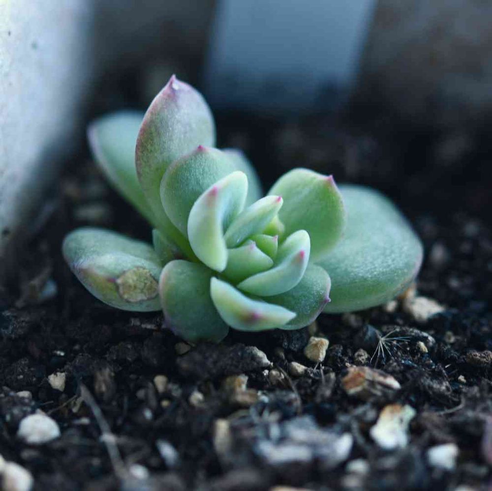 前にホワイトモンローとご紹介した多頭の葉挿しっこはアリタウムだった…フダが入れ替わってしまった様子