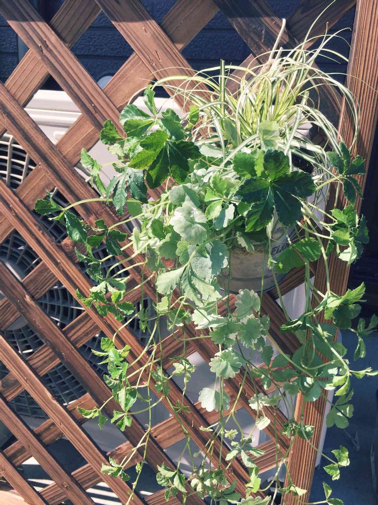 室外機カバーちょうど良いのが無く、ラティス立てて目隠しに。温風当たらないように隅っこにハンギング。グリーンだけの寄せ植えもイイなぁ