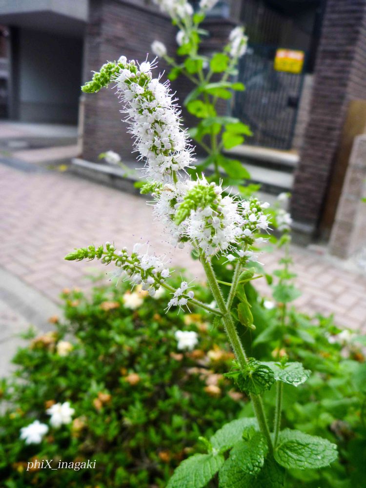 GSジェニックの街の訪問シリーズです。花壇に咲く白い花。葉っぱがシソの仲間と思い,検索すると,マルバハッカ(アップルミント)の様です。次回行くときはぜひ葉っぱのにおいを嗅いでみたいです。