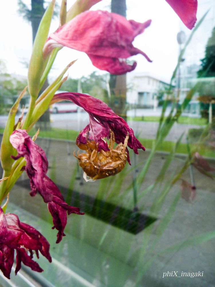 miyukiさん,matuさん,早速の回答ありがとうございます。グラジオラスですね。なるほど(^_^)。そうすると,一日花ではありませんね。navyさんおっしゃる通りです。なんとなく,しおれた花がそう長く茎につながって居そうも無いと思うなか,この蝉は良いチャンスを物にしたなあと思ったからです。校舎のガラスの吹き抜けホールの前ですから,ほかにはほとんど蝉の捕まるような物はありませんでした。