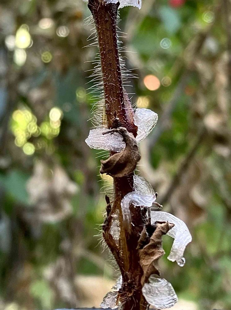 よくある シモバシラという植物🪴には出来るようですが この花の茎にも少し出来るのでマイナス気温に下がって来ると毎朝の楽しみになっています😊 今年は雨が降らないので小さめですね🥲