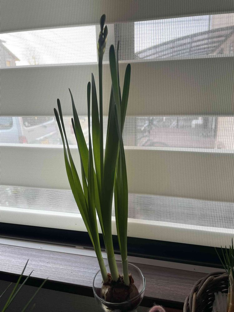 いただいた水仙の球根ですが室内で水栽培している子は早くも蕾をつけました❗️南の窓側でぬくぬくとしていますからね。逆光で見にくいので、順光で撮ってみました。