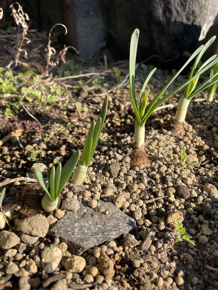 外の日向夏の木の下の子たちは葉っぱの伸びも室内の子の1/3程度です。おまけにヨモギが植えてある場所なので芽吹き始めたヨモギの地下茎に押し上げられるのか、埋めても埋めても球根が飛び出て来ます。植え替えたほうがいいかな?