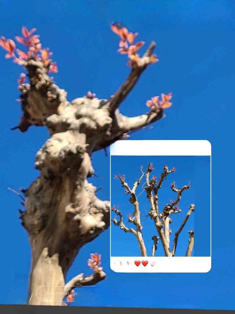 裸になったゴツゴツしたサルスベリ見上げると新芽と若葉が付き出しました✨️