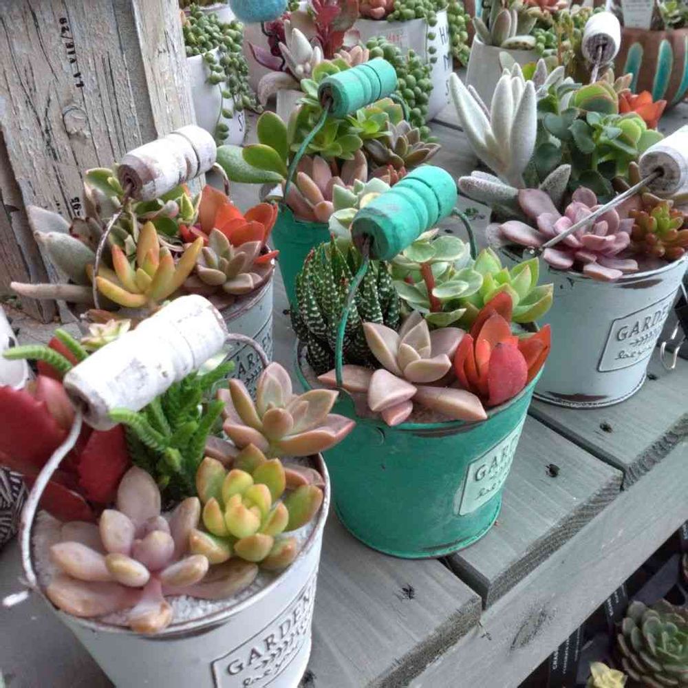 ブリキポットの寄せ植え。ひとつひとつ植えられている多肉が違うのでお気に入りのひとつ探しが楽しめるポットです
