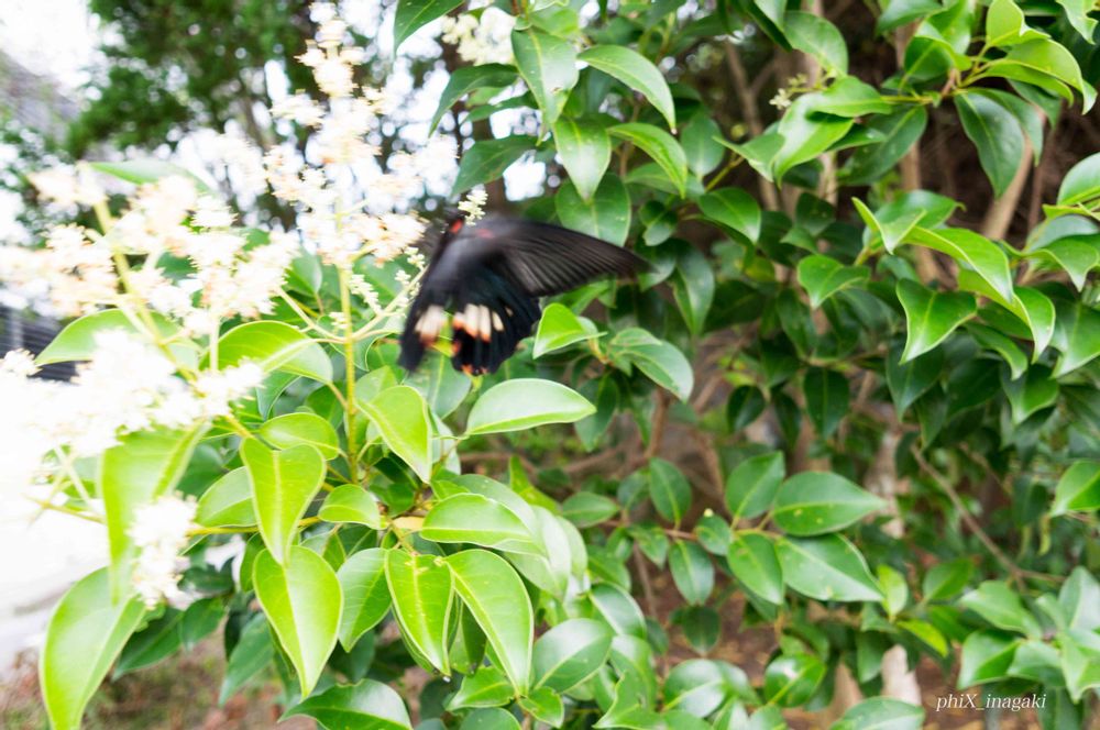 駐車場の隅のネズミモチの木を毎日見ます。花が散って道路が白く染まっています。ナガサキアゲハのメスが,さっと,飛来しました。慌ててシャッターを切ったので,ぶれてるし,花もいまいちですが,メスの上の羽の根元の赤い印が綺麗なので,本人としては気に入っております。いかがでしょうか?