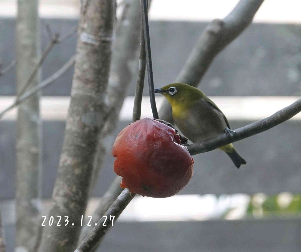 すっかり葉を落としたアオダモの木に~熟した甘い柿を吊るしています…初めはヒヨドリが啄み、メジロがやって来ました‥👀🐦✨