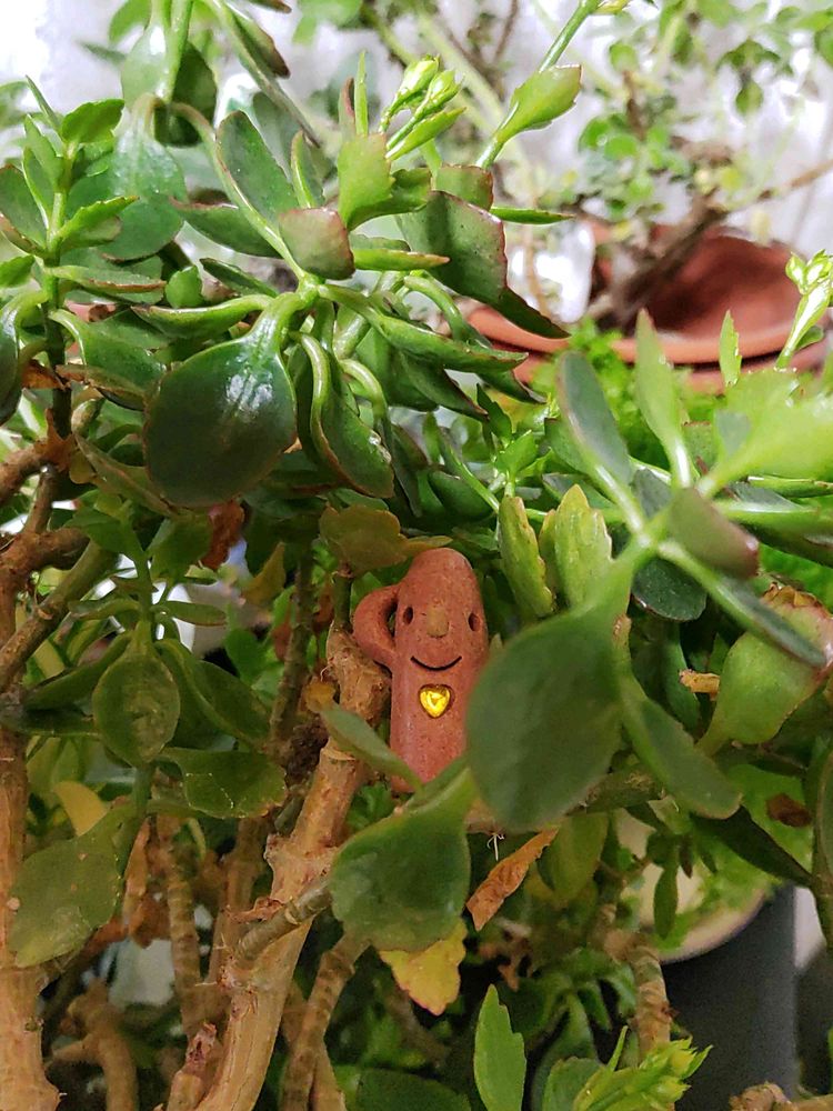 シャコバサボテンとカランコエのグリーンの中のハニワくんの笑顔が可愛いな🌿