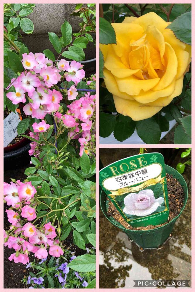 はいっ❣️スイチ入りましたえこりん村のショップで…つるバラ欲しいけど来年だぁな〜って眺めてたら、「俺これ好きだっ」って🙄黄色レヨンドゥソレイユ、ピンクバレリーナ、思いのほかお安めで大株でした!右下はブルーバーユー、ホームセンターで一昨日に買い物してる時に黒星病になって600円の小さな株、ブルー系は難しいし今年はたくさん買ったからと眺めて居たら…「俺この色好きだ」ってポイっとカゴへ…😳