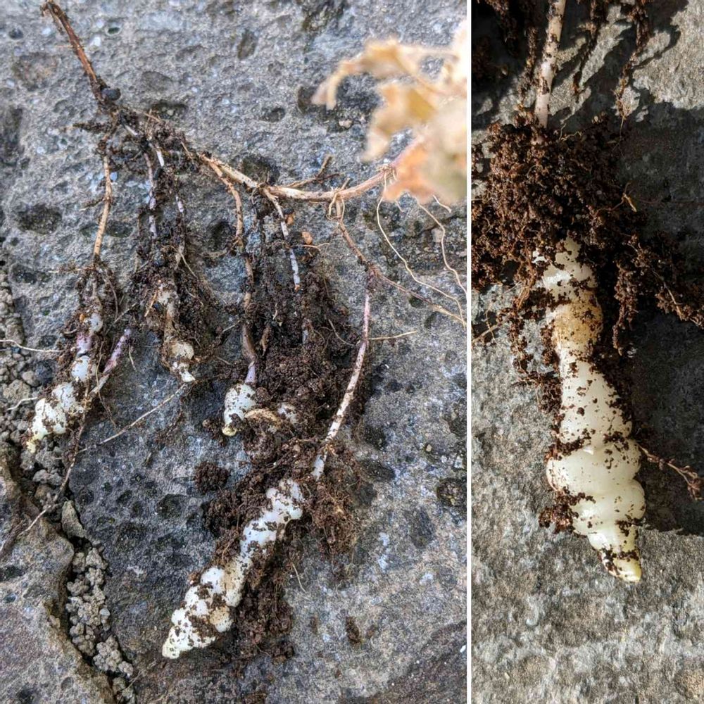横になっているのを引き抜いてみたら~白くネジレタ可愛らしい巻き貝みたいなのが連なって出てきました(3枚目pic)‥💕