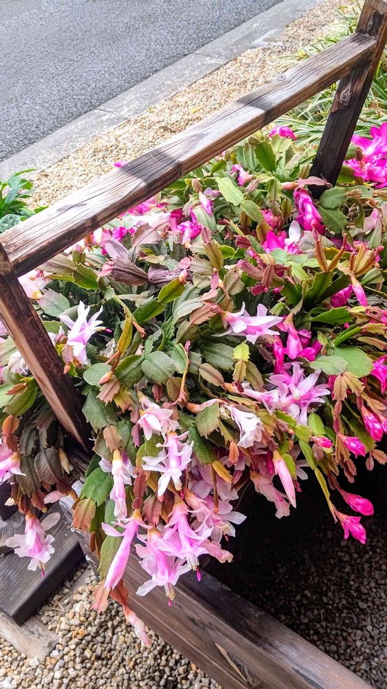 ご近所マンションの玄関前、綺麗✨にニ色のシャコバサボテンが見事に咲いています。