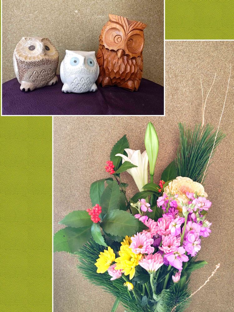 フェイクだとまた来年も使えそう😁フクロウさん、お花の影に隠れてるの見えました♡
