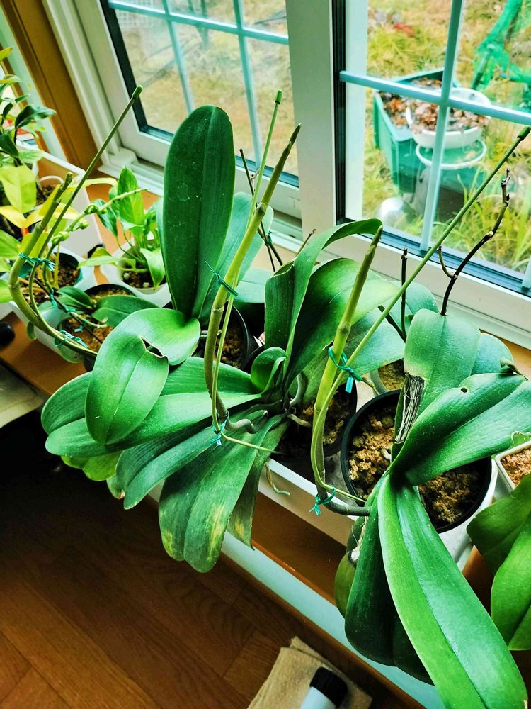 蘭が元気です。胡蝶蘭の花芽、こないだ支柱をしてから15cmほど伸びました。きれいに伸びてくれています。葉っぱはズタボロだけど。ごめん、ほんと。