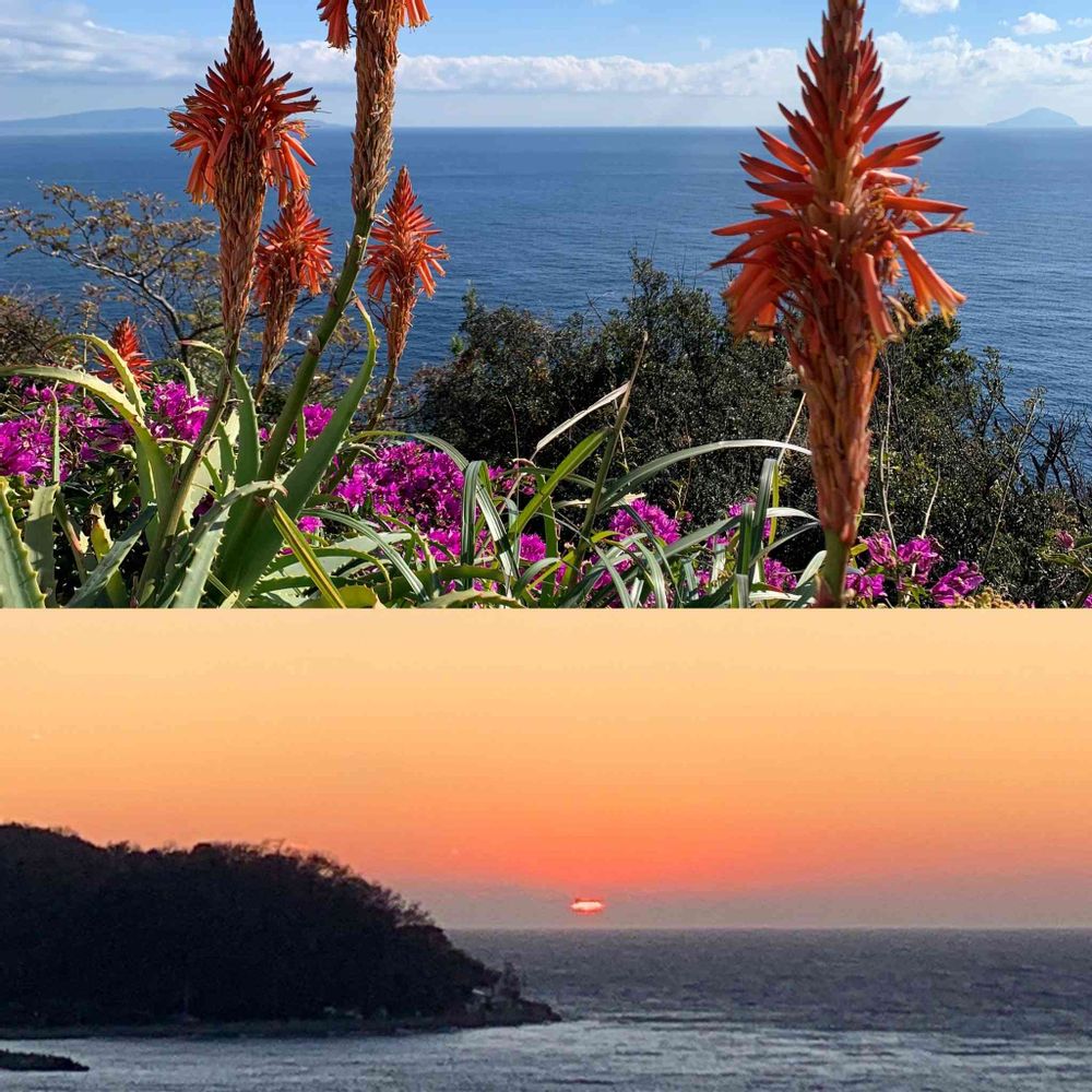 アロエ祭りでアロエのお花を見てきました♪とんがり帽子が並んでいるようで可愛らしい🔺下はホテルから見た土肥港の夕焼け🌆です。綺麗❣️皆さま、大掃除頑張りましょうね🧹🧼🧽