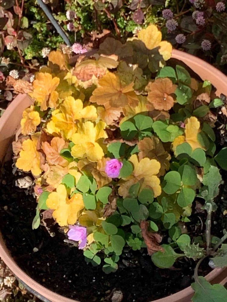 古い寄せ植えから植え直して養生していたヒューケラドルチェバタークリーム、オキザリスオックスローズも残ってたみたいでこちらも開花してくれました。