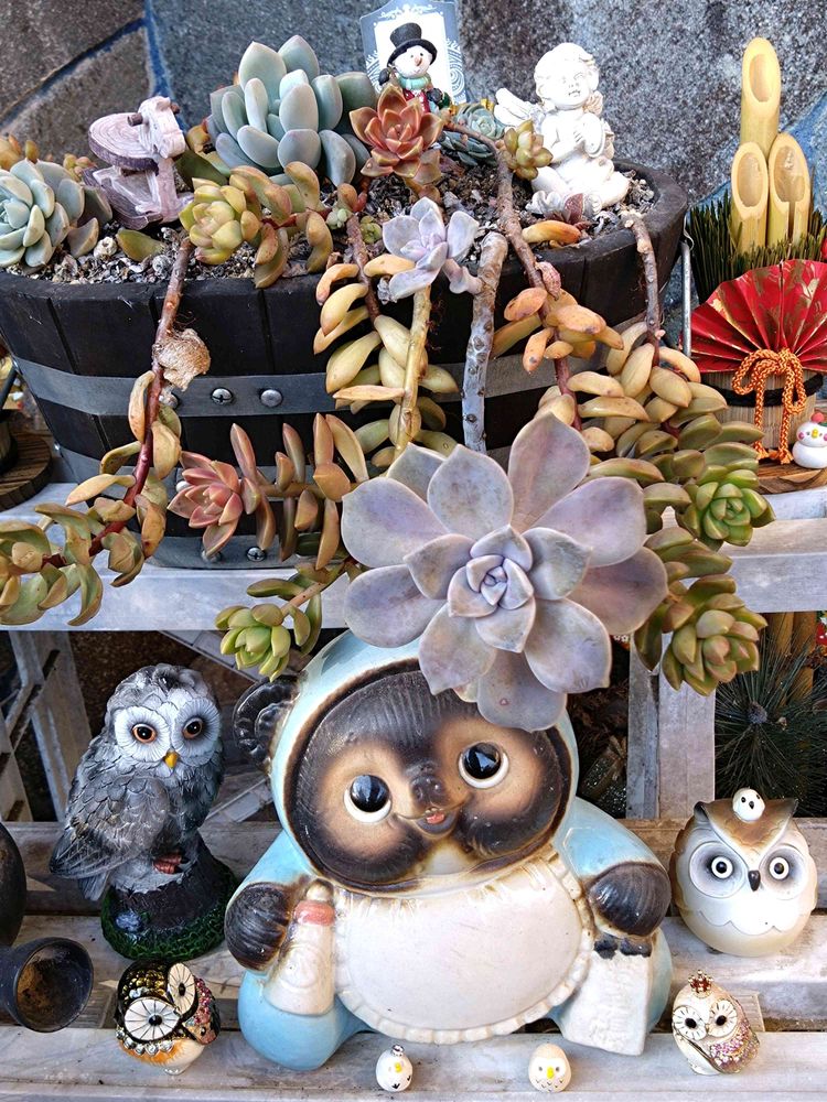 長〜く伸びた多肉ちゃんが丁度フクロウ🦉さんの花飾りの様で可愛いね😍