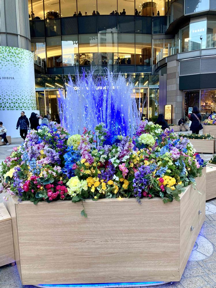 東京ミッドタウン日比谷のステップ広場に現れた花々とイルミネーションが飾られた憩いの場。