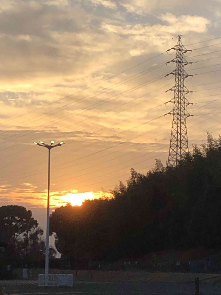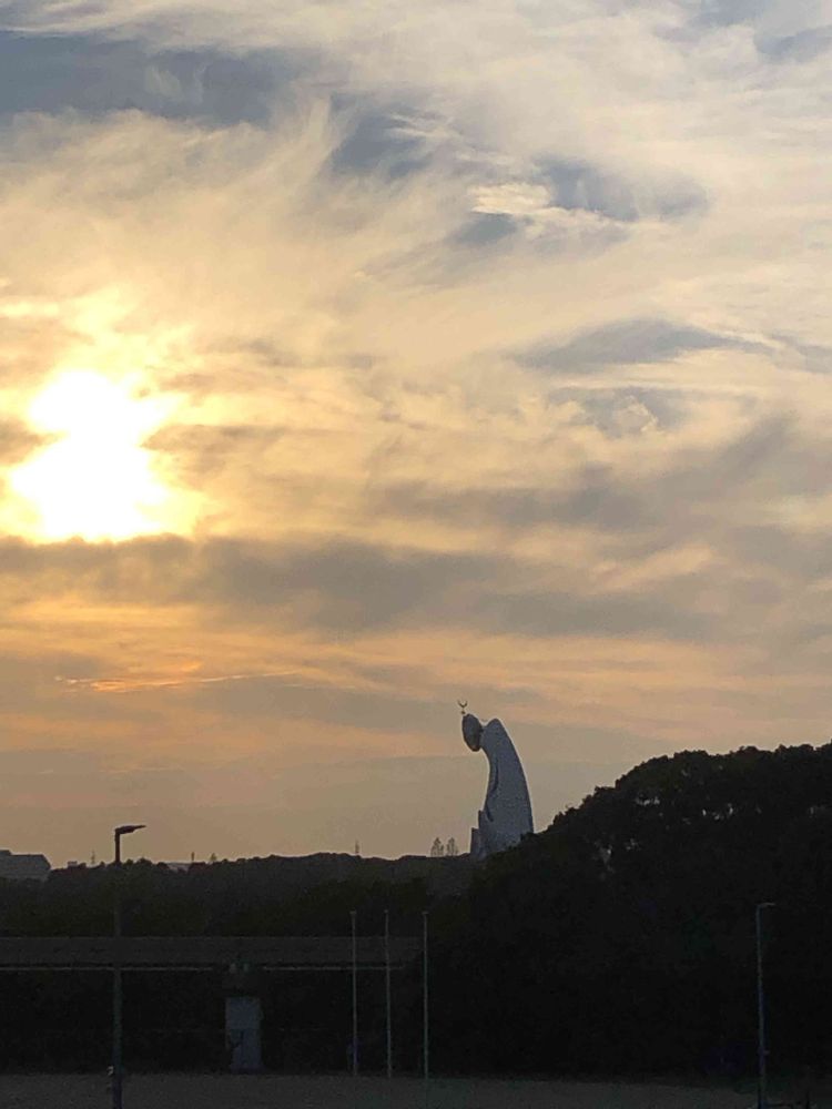 夕日を眺める「太陽の塔」、空の雲が来年の干支「龍の顔」のように見え、火の玉(太陽)を咥えています。🌇🐉🐲🌞😄