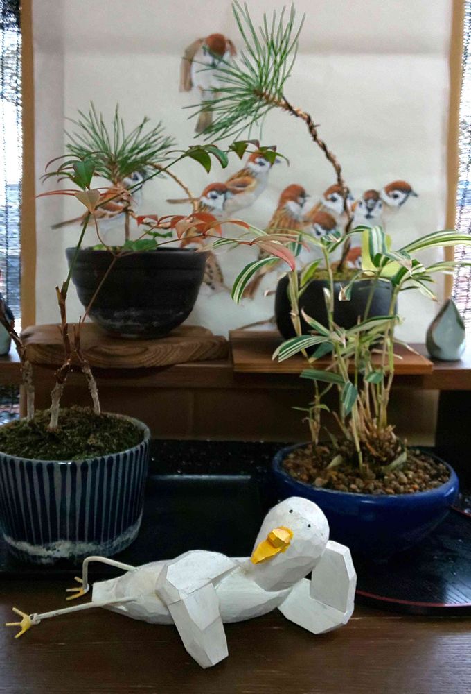 盆栽と描いた雀さんのコラボ、凝ってますね~!