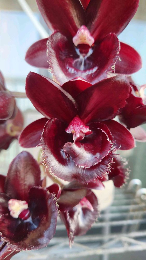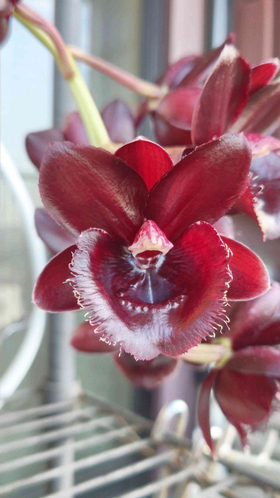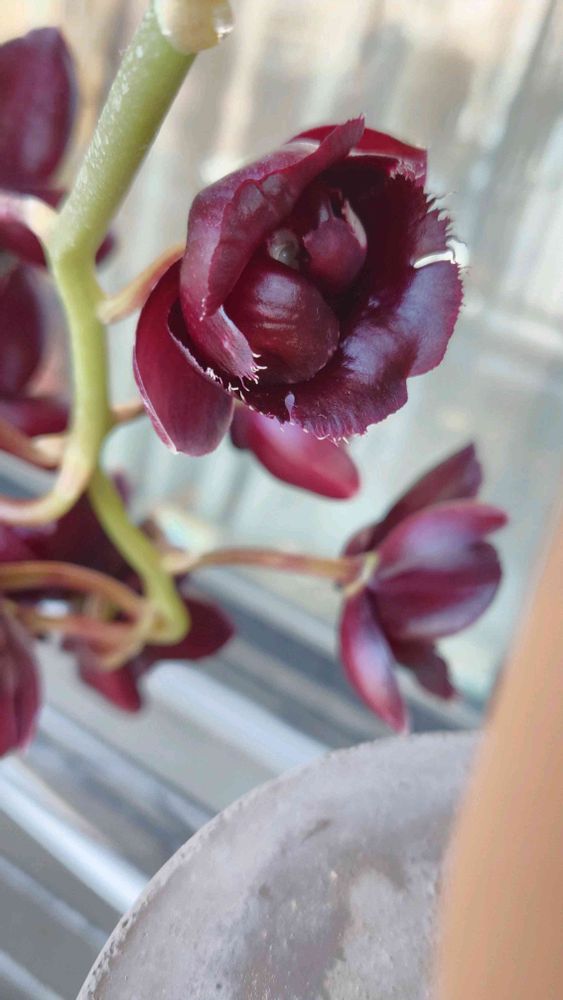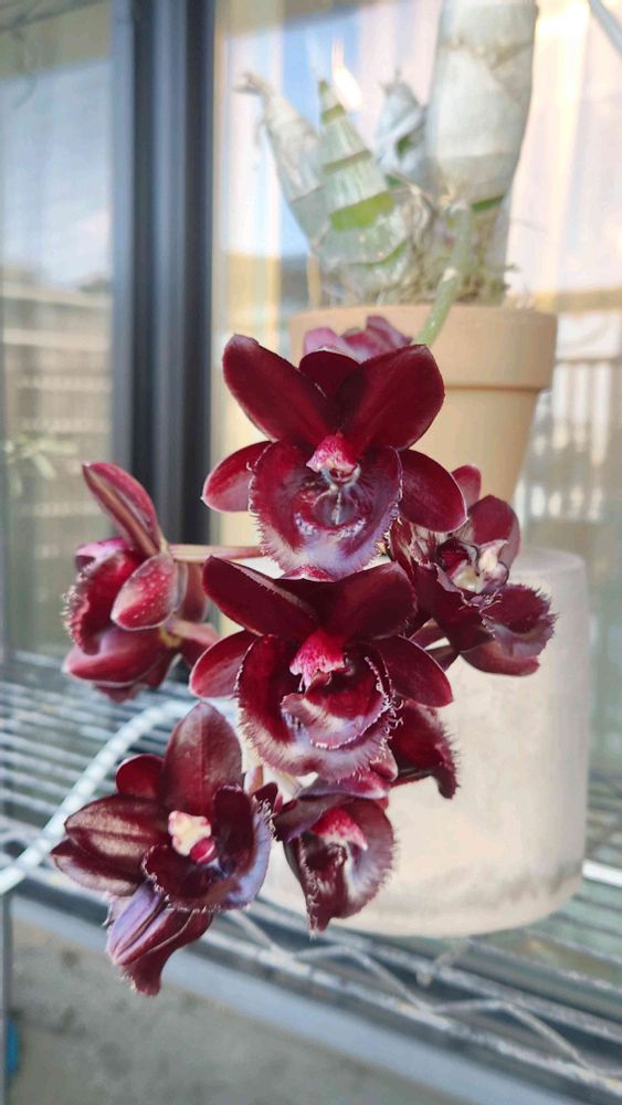 Fdk. Enter Light Fdk. After Dark"S.V.O Black Pearl " × Ctsm pileatum fma. album 咲きました。黒い花と白い花の交配ですが白完敗。あえていえば花色が黒より赤みがかってますが、これが白要素によるものなのかどうか。 先に咲いたFdk. julio david riosよりリップ含めぜんたいにやや大きめです。匂いはなし。julio david riosは微かにハーブっぽさもあるハッカ系の香りが少しあります。 さて、ちょうど真ん中らへんの花に違和感ありませんか? 実は10輪中3輪が奇形花というやつらしく、「二枚舌」だったり花2つが上下で合わさったような形だったりします。何が原因でこうなったのか、はっきりはしませんが、花色も、わりと密に蕾がつく感じも悪くないので、来年以降はこの変わり花が減ると良いな。(4枚目は普通に咲いたものの一つ。スタンダードな感じの花型です)