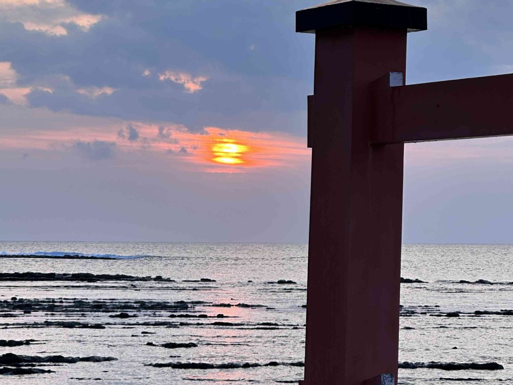 📝#3,#4:⛩️大鳥居から観た☀️朝陽の様子で、青島神社の前に在る鬼の洗濯板が写っています🐶
