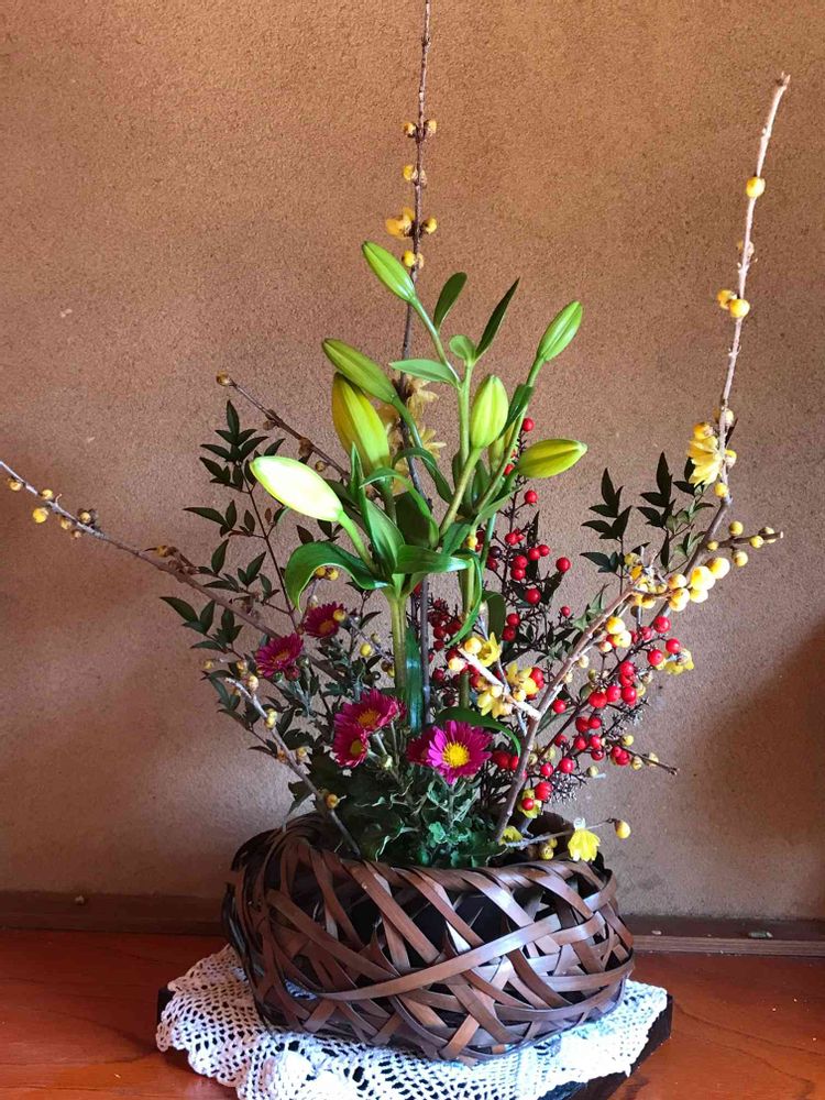 毎年暮れに義妹の所から届いた、百合と自宅で咲いている、蝋梅、寒菊、南天で、正月🎍用の、生花を飾りました。