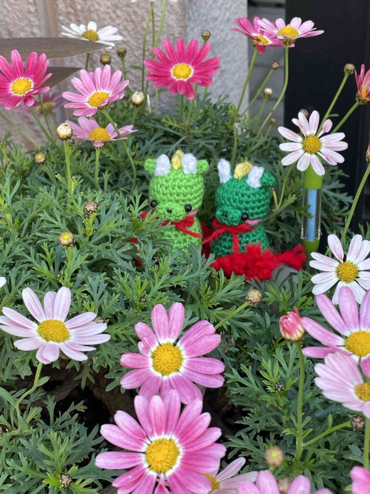 可愛い寄せ植えですね、春らしいお色編みぐるみも可愛い(ノ≧▽≦)ノマーガレット好きです。葉も綺麗なのですね。秋にノコンギク咲きましたが花はとても良い感じなのに葉っぱが汚いのが気になりました~色々調べたけど原因はわからず。やはり花も葉っぱも綺麗だと嬉しいですね