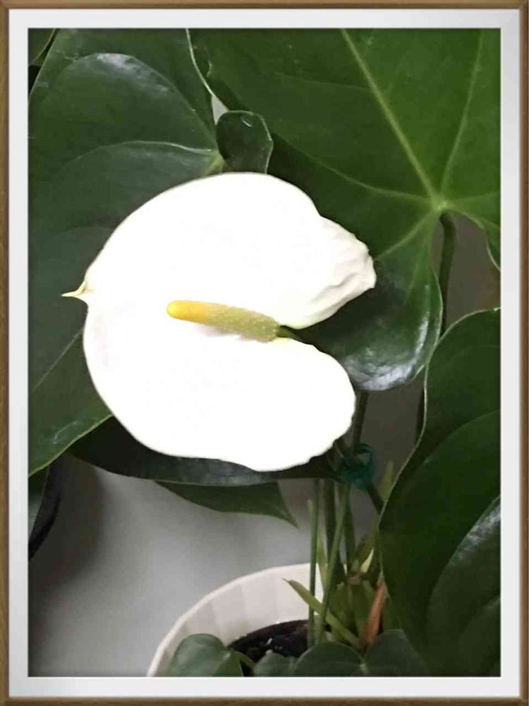 真っ白なアンスリウムシャレード、外の暑さは知らないみたいに咲いてます🤗つぼみも付いたから、また楽しみだなー😀