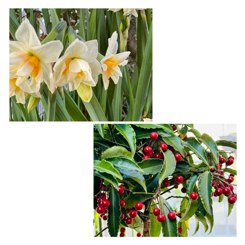 小庭の水仙とマンリョウ お正月らしい色探して🎍📱
