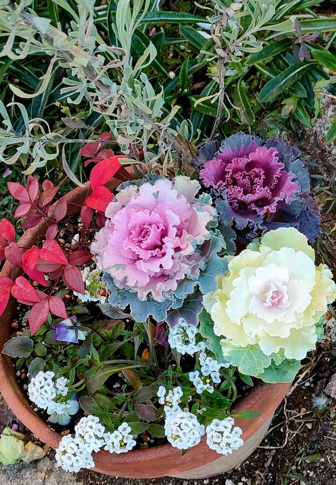 葉牡丹の寄せ植え素敵ですね〜✨ビオラの青い花が咲き始めるの楽しみですね😊💟💜💙