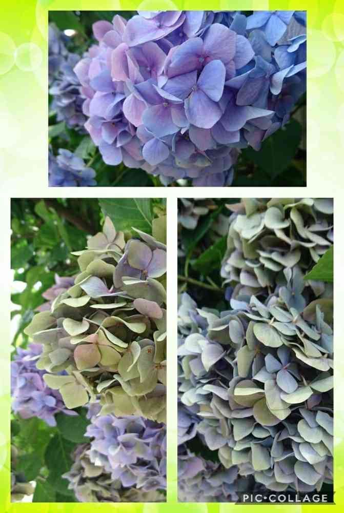 同じ紫陽花の株に、上の紫色も下のアンティークな緑も咲いていました。マジカルシリーズのマジカルアメジストかな?