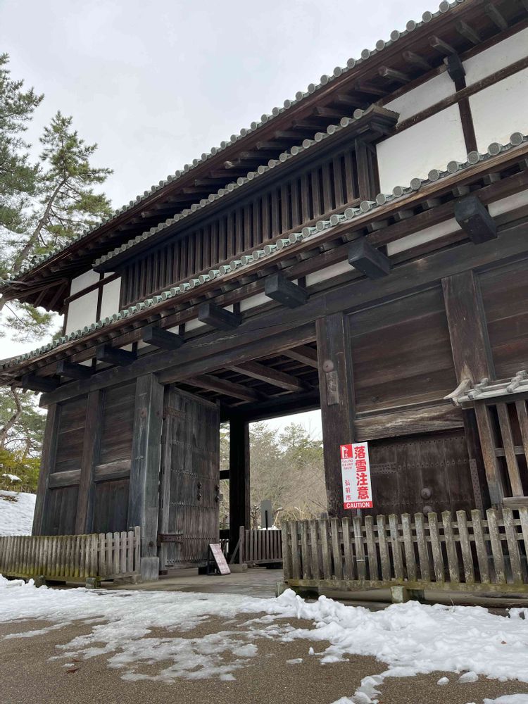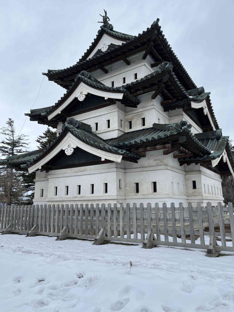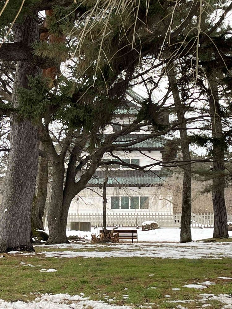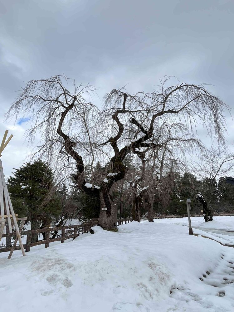お堀修復で曳家で移動、今だけ見れるお城の位置。桜の名所の弘前城枝垂れ桜、お花がなくても美しい。お城は天然の谷に挟まれで街が護られてる地形ですね☺️