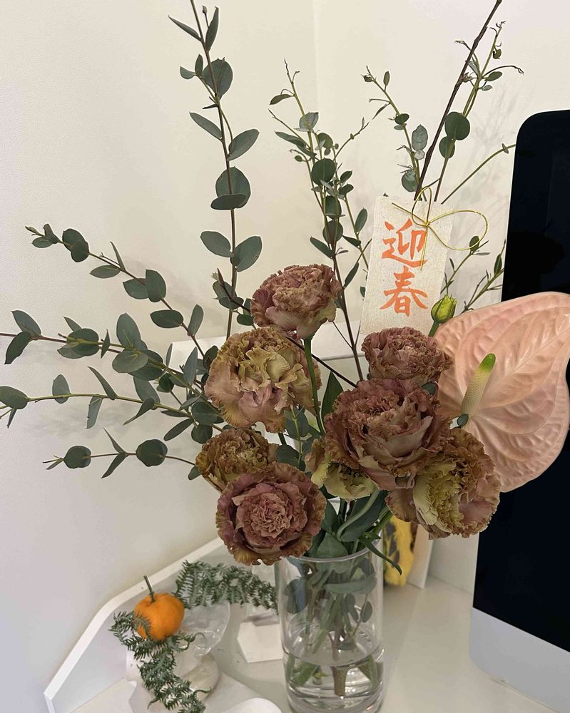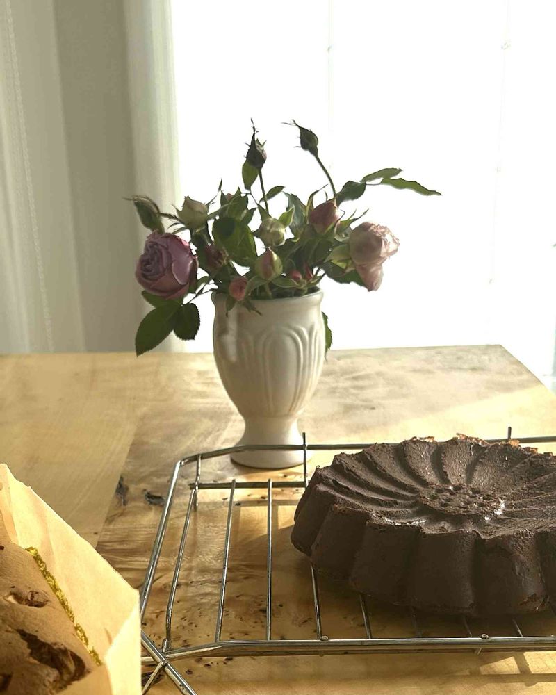 ③新年はひとりで留守番しているので、お菓子作りました。庭のバラの蕾を突っ込んだ器は100均のもの。