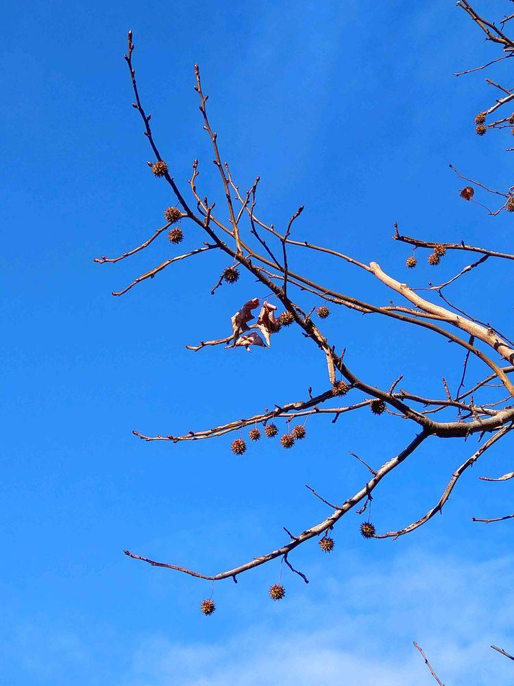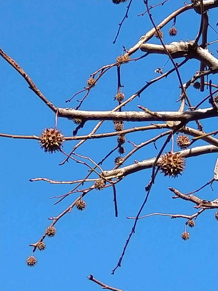 青空を背景に、トゲトゲのおもしろい実・モミジバフウの実です。