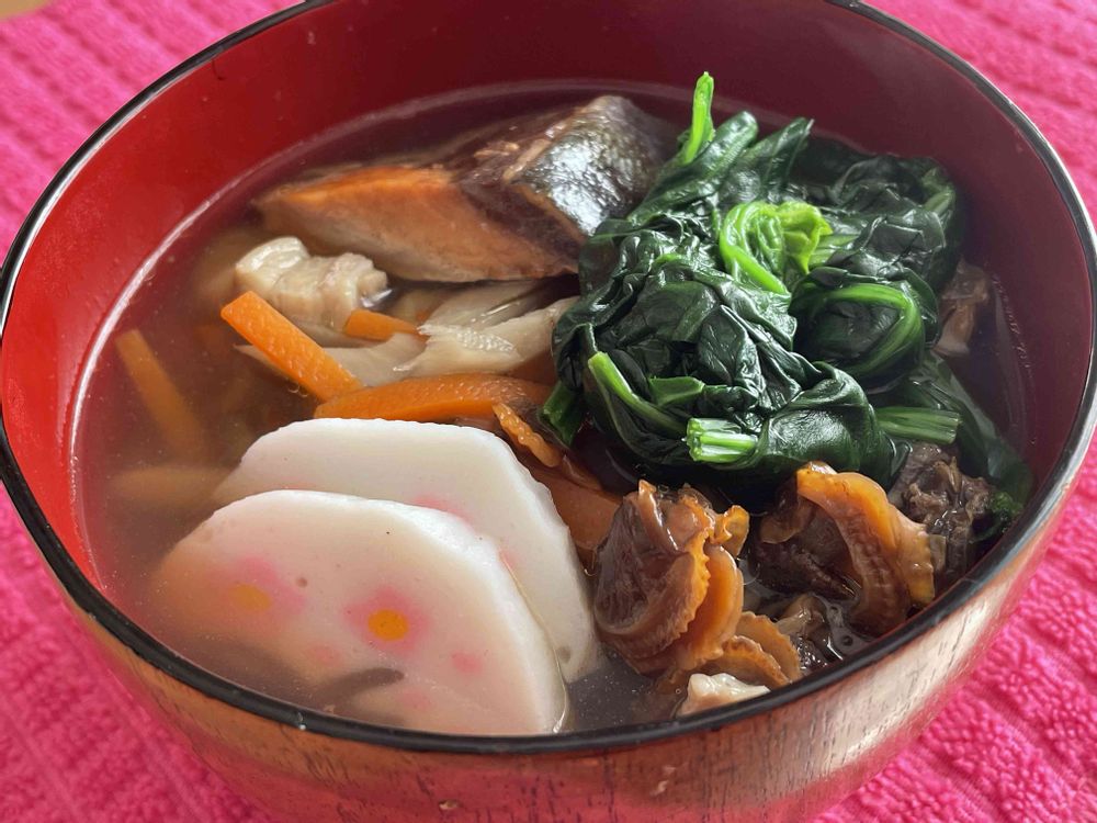 実家のは、すまし汁です。ごぼう、にんじん、鶏肉、ほうれん草、も貝、ぶり、かまぼこ かな。