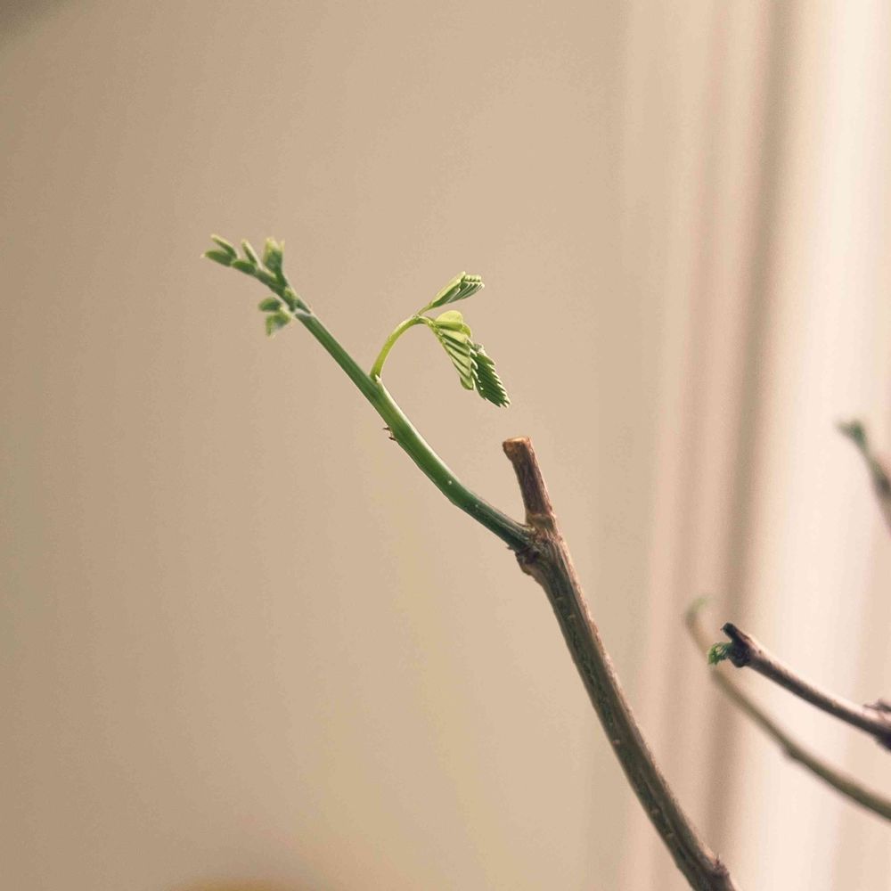 一旦葉っぱが黄葉して全部落ちたのに、室内が適温だからなのか、あちこちの枝から新しい葉っぱが😇 特にこの枝は動きが止まりません。こうなったとき水やりはどうするのがいいんでしょう?葉っぱが出ているということは水も必要かと思い、一週間に一回軽く(土の表面が湿るくらい)水やりしてますが、今まで冬はほぼ断水していたので怖い…