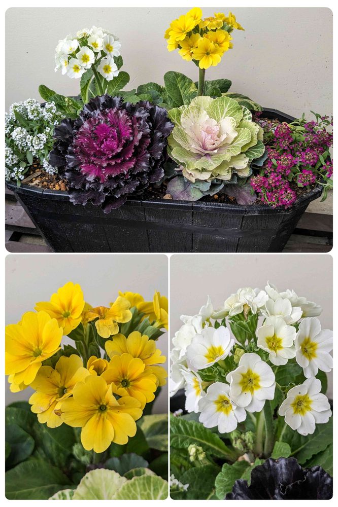 ガーデンプリムラアラカルトシュシュ、葉牡丹、アリッサムの寄植えしました。