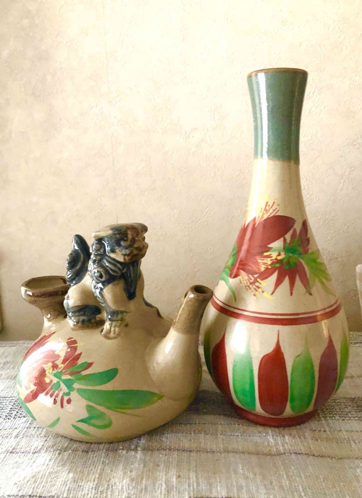 🧐沖縄の伝統的な酒器で、カラカラ本体の中に玉が入っており、おちょこ一杯分のお酒が出て止まる仕組みになっている。空になるとカラカラと音がする。