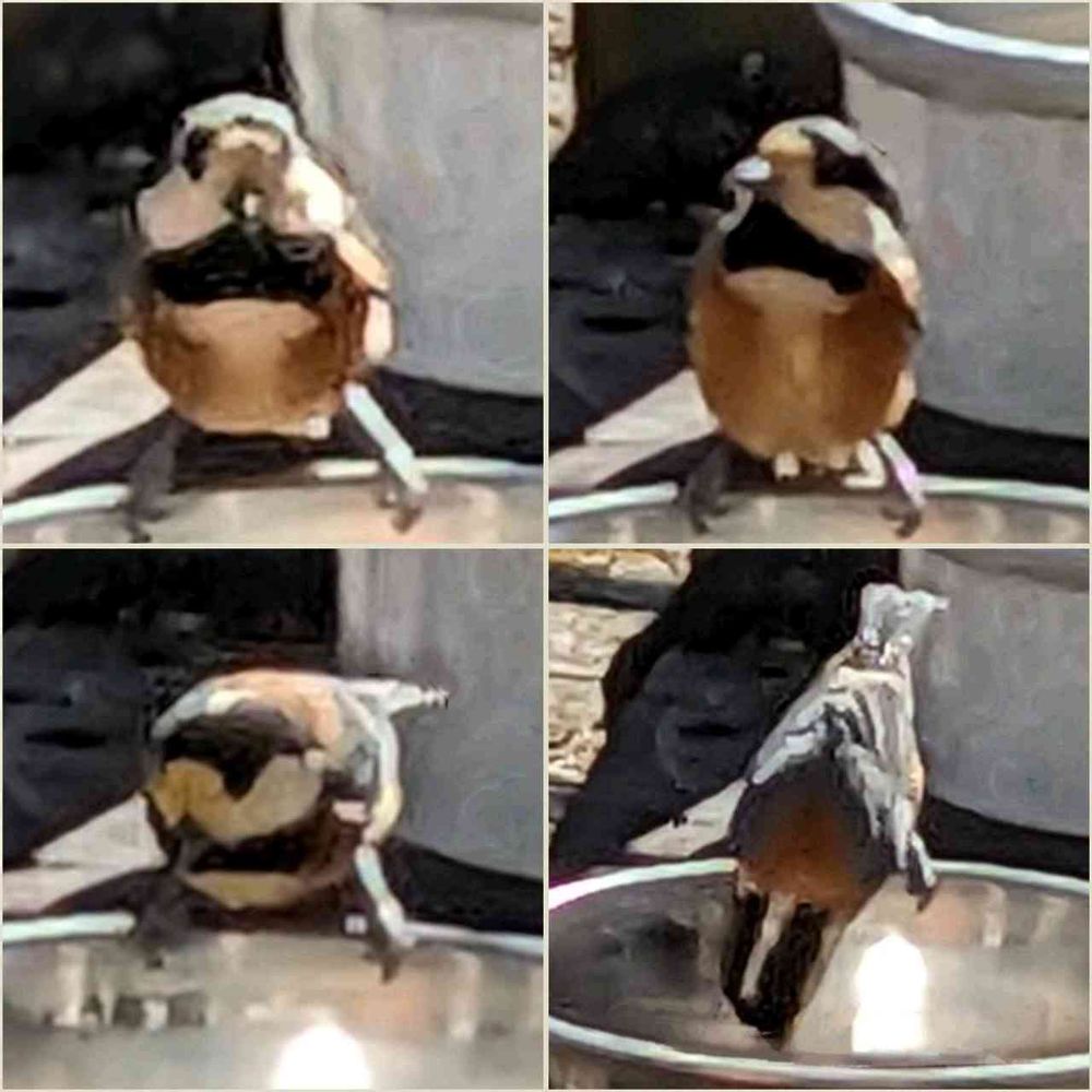 コンコンエゴの実を割る音がしたあと ニャン用のお水で喉を潤しにデッキに来た山雀さん