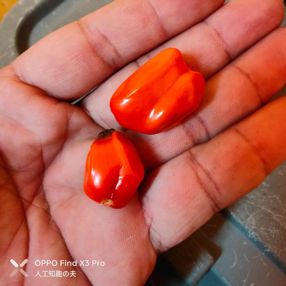 六角図形の亀裂の中から真っ赤な赤ピーマンみたいな種子を採種♪