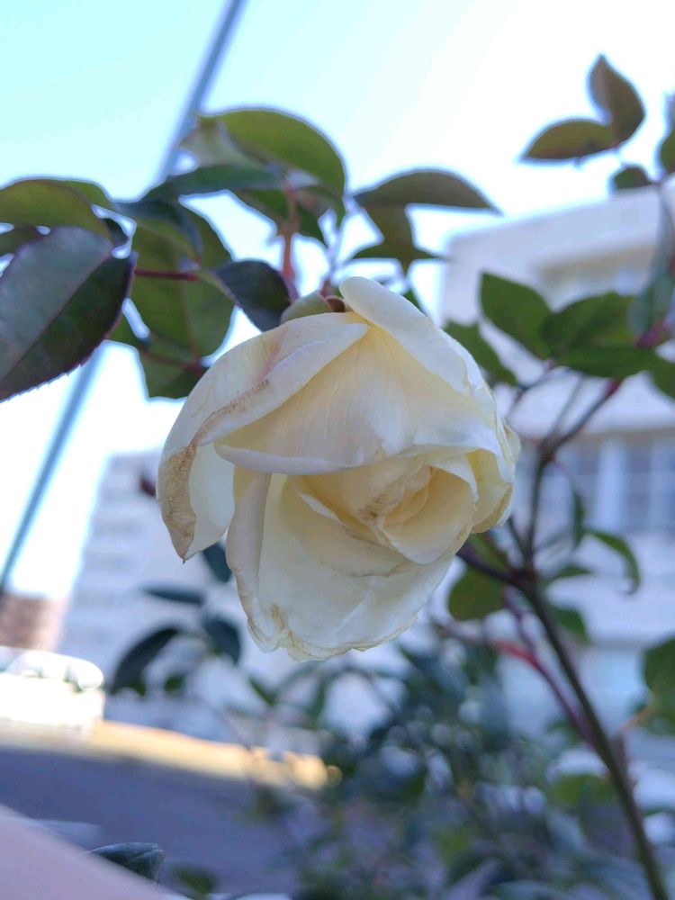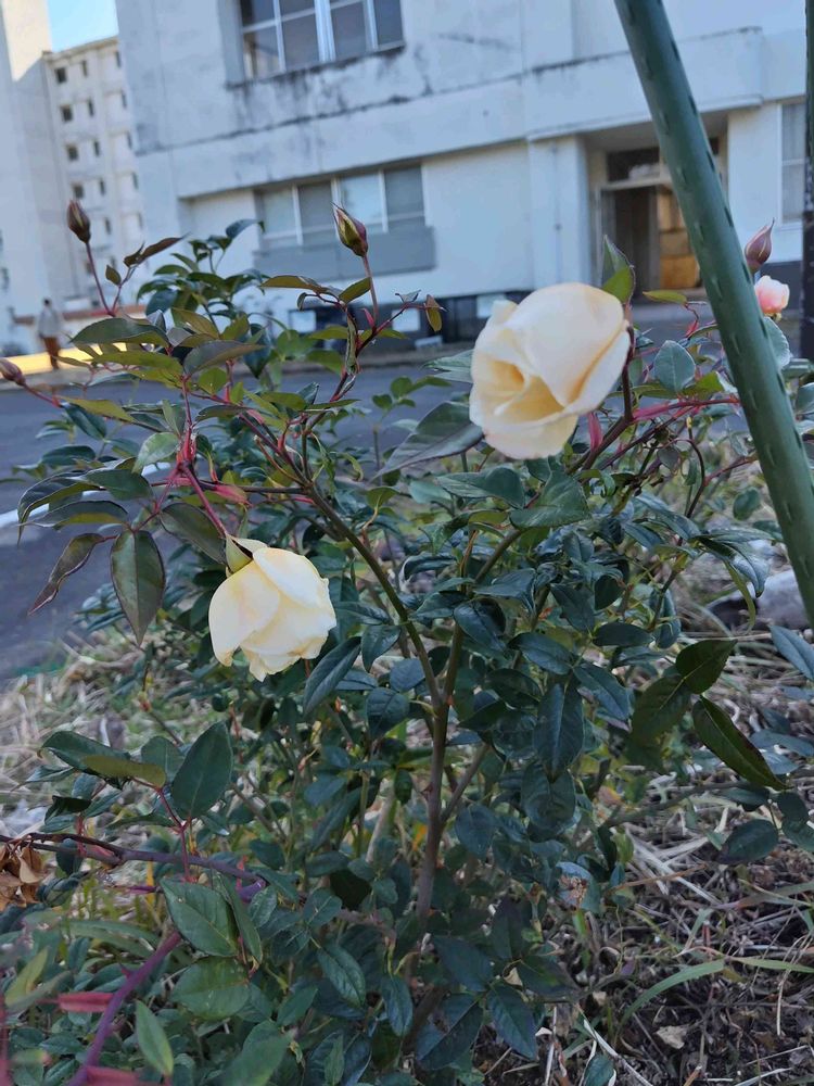 冬になり日当たりが悪くなったからか、はたまた低温からか、綺麗なクリーム色で咲いてくれた。