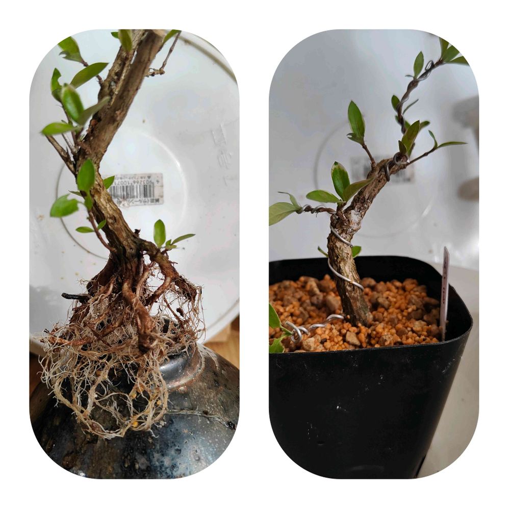 挿木で余った少し太い所を挿して置いたら二年で根も葉も無い(噂)所からいい塩梅に出た枯れ枝取ったり根を切り詰めたりして癒合剤やらルートン節約の為少し深植えして少し針金かけて矯正した夏頃には駄鉢(駄温鉢)素焼き鉢に昇格かも