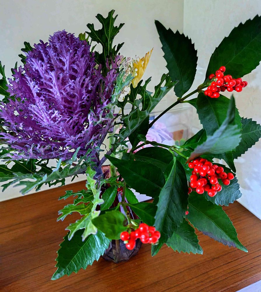 綺麗な色💜の葉牡丹と真っ赤♥️な千両。