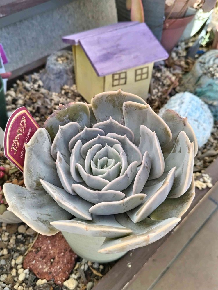 花福袋に入っていたイケベリア。レウレシアと迷いましたが初めて育てます。多肉初心者。後ろの紫色の屋根は木で作りセメダインで仮止め。ところが孫が中に土が満タンに入っていました。新しい物を置くとイタズラの餌食になります
