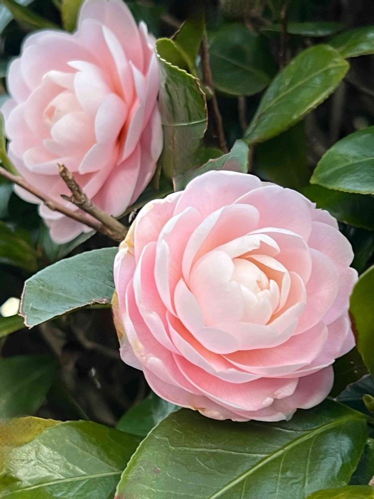 ピンクの花びらが八重咲きの丸い可愛い椿