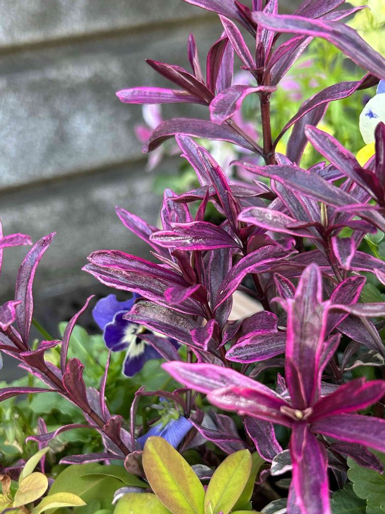 寄せ植えにしたへーべ アイスイザベラが秋から温度が下がると緑からピンク、赤、紫と変化するようでとても綺麗なピンク紫になつています🌿💕🌿