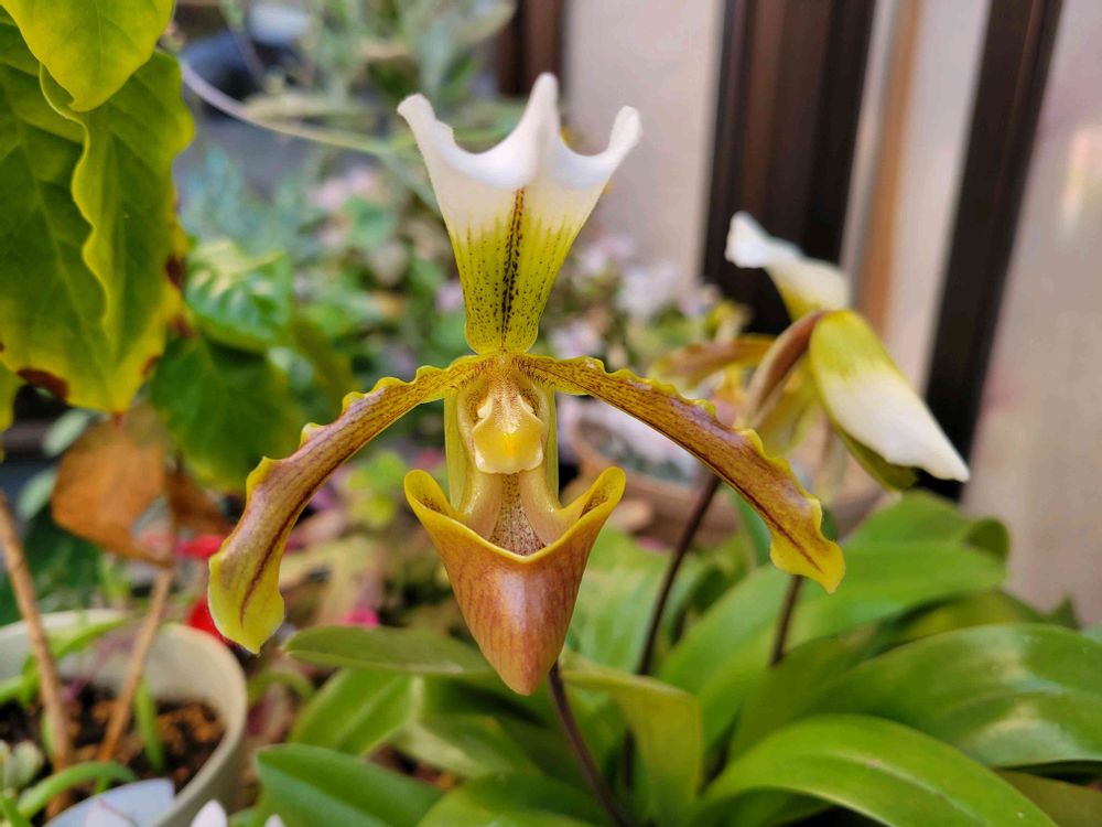 こちらは、パフィオペディラムさんです。見れば見るほど不思議なお花です😆