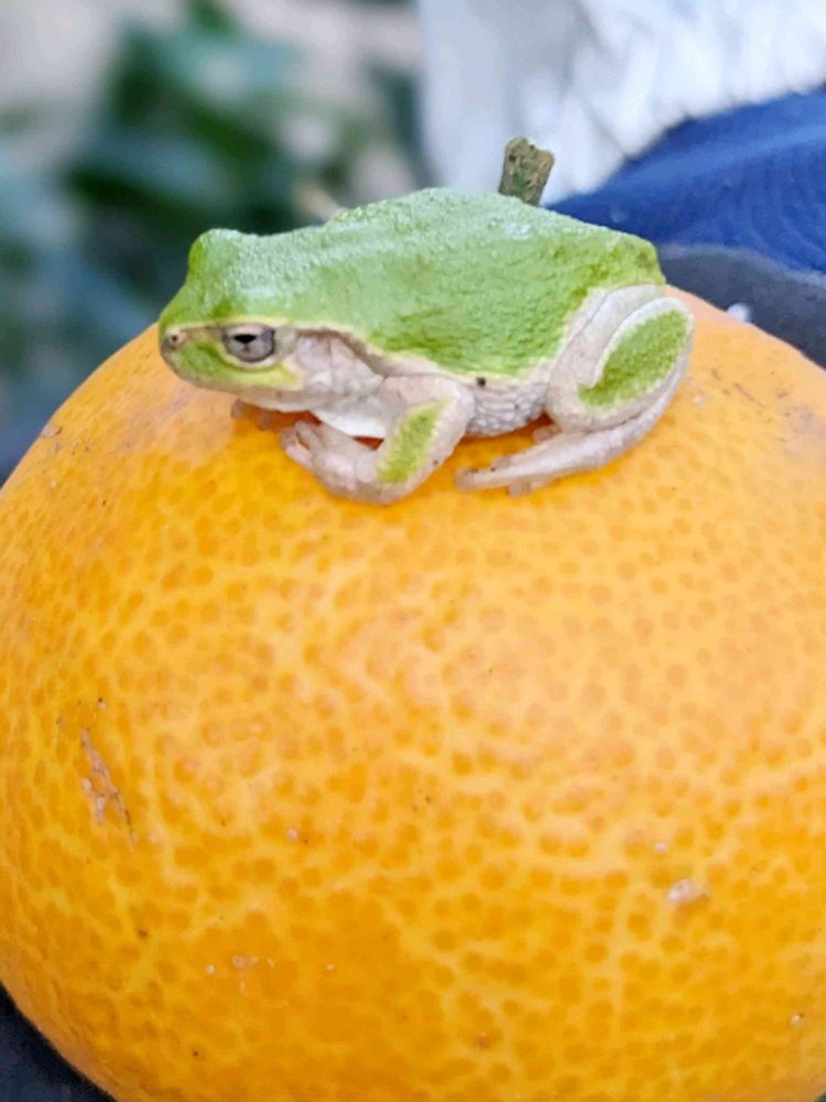 🍊の上の🐸作り物みたいな色してるね😅